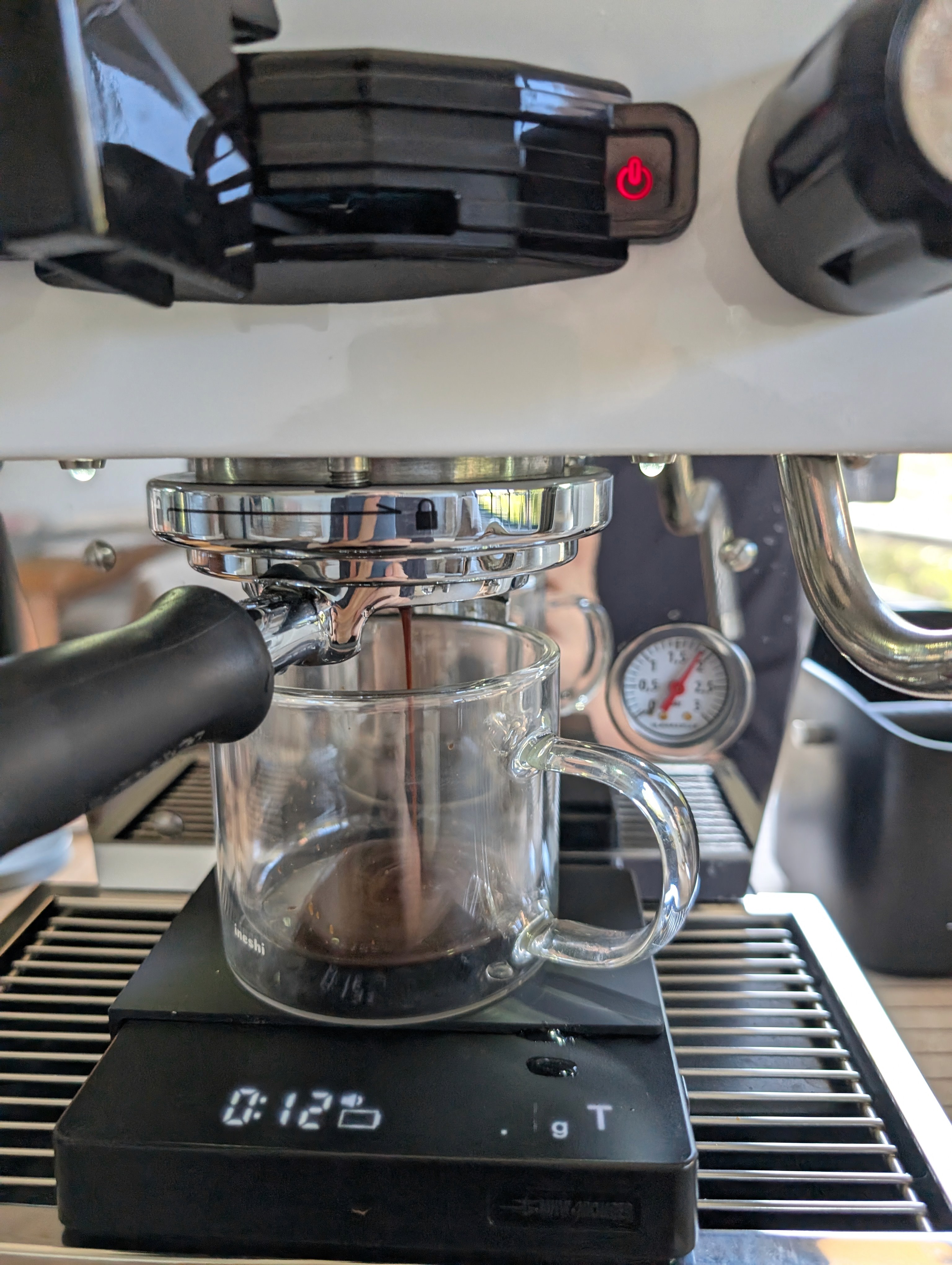 There is a recipe to this (SCIENCE). The ratio is a 2:1 yield. So one gram of coffee is equivalent to 2 ml of liquid gold! I have a bottomless PF to see the extraction take place. I also time the shot to be between 20-30s.
